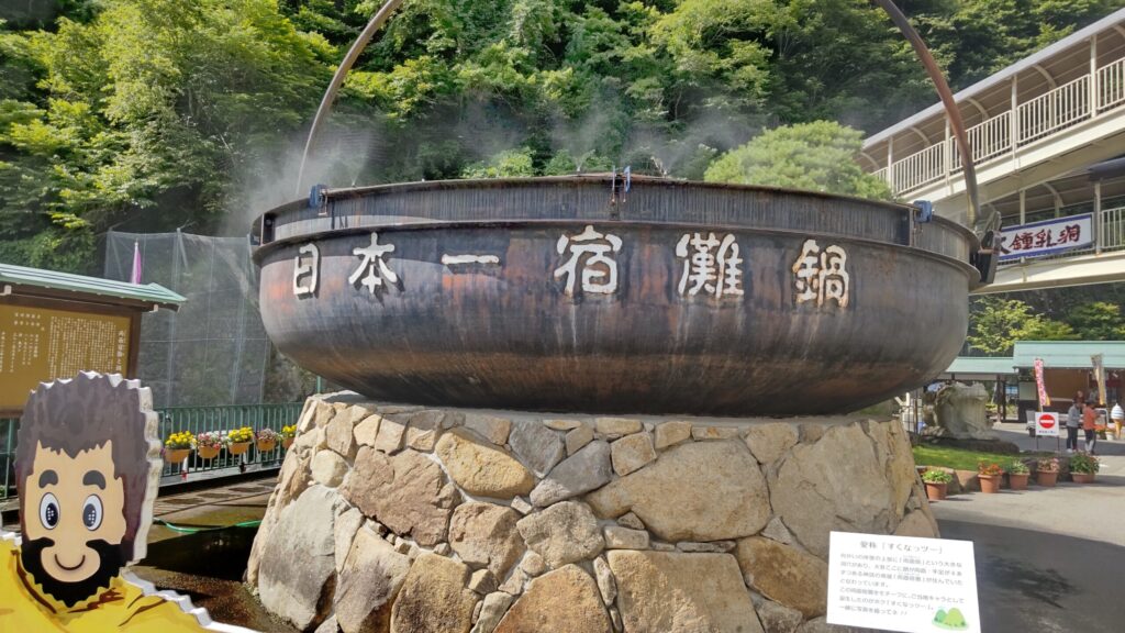 両面宿儺ゆかりの地でもあるらしく、駐車場にある建物の一つにパネル展、駐車場を上がってすぐのところには日本一宿儺鍋という巨大な鍋が置かれています。